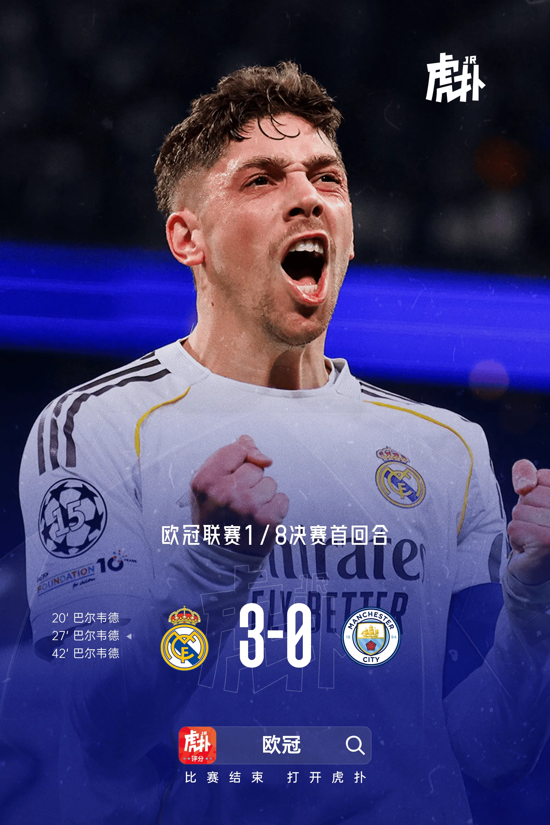 虎扑03月11日讯 欧冠1/8决赛首回合,皇马主场在伯纳乌球场迎战曼城。比赛中,乌拉圭中场巴尔韦德在45分钟内上演帽子戏法,帮助皇马在主场取得关键胜利。赛后,《阿斯报》副主编龙赛罗撰文称赞了巴尔韦德的表现,并再次谈到了皇马的欧冠传统。